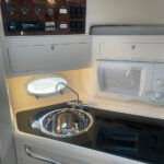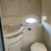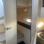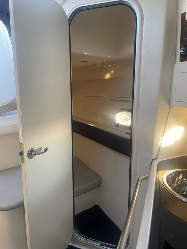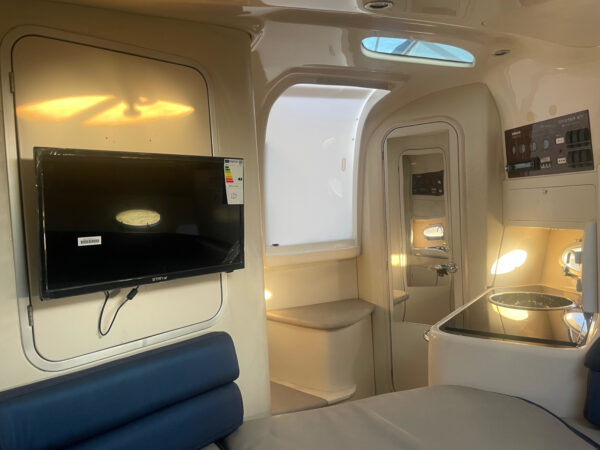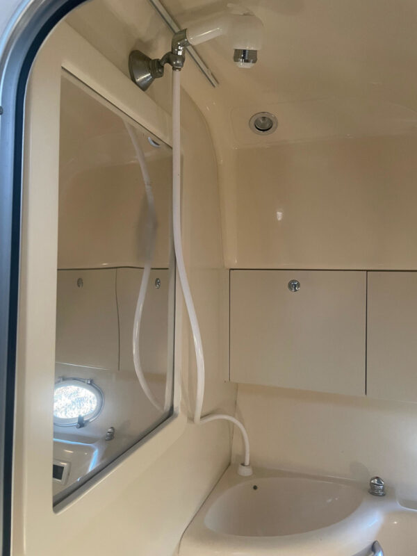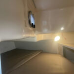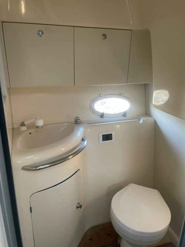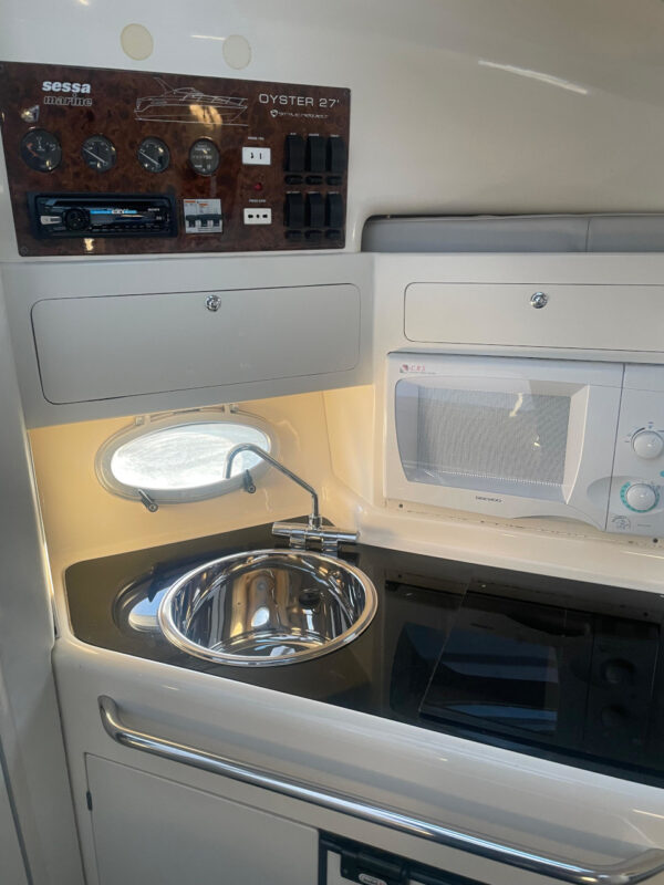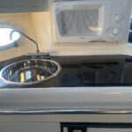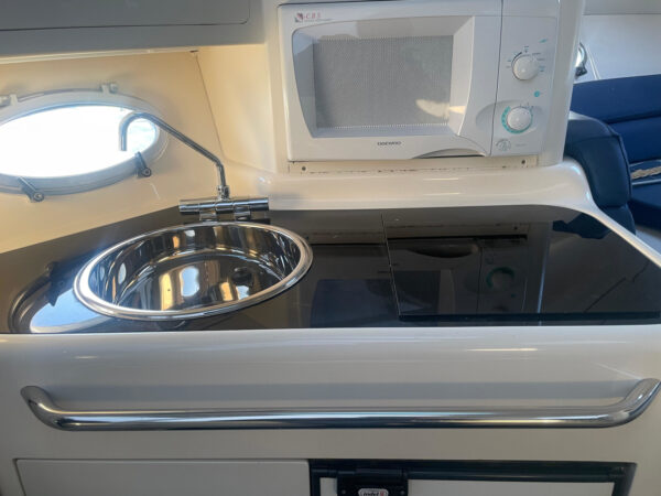 Scendendo sotto coperta troviamo sulla sinistra una comoda cucina ad angolo, completa di lavandino, fornello a induzione, microonde e un capiente frigo a compressore, sulla dx un grande bagno completo di lavandino, wc elettrico, doccia integrata con pompa di svuotamento automatico.